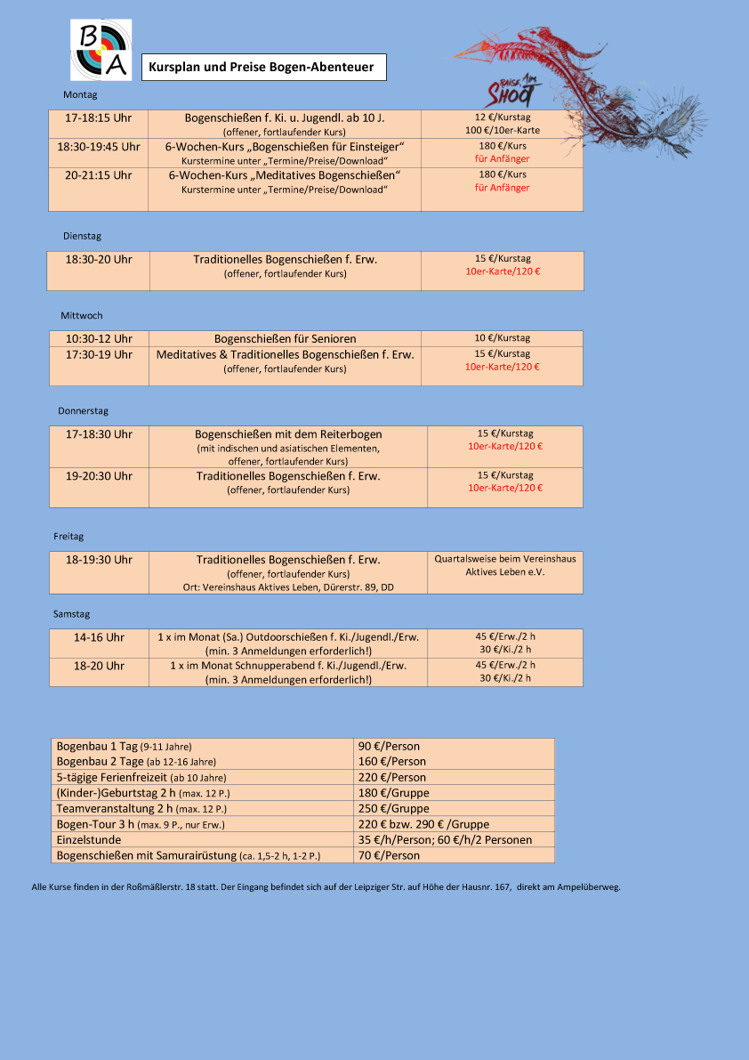 2.) Traditionelles Bogenschießen, indoor/outdoor Mai-Sept., jeden Di. 18:30-20 Uhr, 15 €/Kurstag/Person, 10er-Karte 120 €/Person